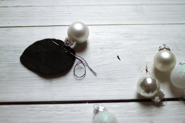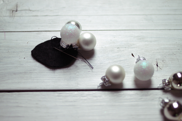 Los geht's mit dem befestigen der Kugeln. An den kleinen Metallringen lassen sich die Glitzerbällchen einfach an den Filz nähen.