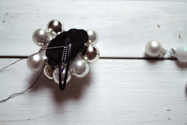Wenn alle Kugeln befestigt sind, dreht ihr das Ganze um und näht die Haarspange fest. Zuerst könnt ihr ausprobieren wo ihr die am besten positioniert, sodass euer Haarschmuck am nettesten zwischen den Haaren sitzt.